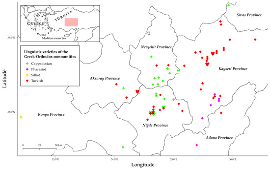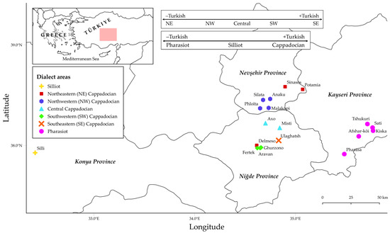 The dialectal data examined in this study pertains to the Greek dialects of iAMGr (Kontosopoulos, 1981/2008, pp. 6–10). These dialects were historically spoken by Greek-Orthodox communities that inhabited the Cappadocian plateau in the southeastern region of Asia Minor, which is nowadays Central Turkey (Figure 1). The iAMGr dialect group consists of three closely related dialects (Dawkins, 1916): Cappadocian, predominantly spoken in various villages across Niğde, Nevşehir, and Kayseri; Pharasiot, used in Pharasa and five adjacent villages in southeastern Kayseri; and Silliot, used in the village of Silli near the town of Konya.2