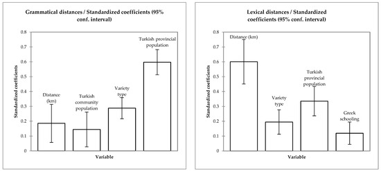 Building on the preceding discussion, this study emphasizes the importance of a socially oriented perspective for a comprehensive understanding of dialectal distances in language contact settings. In this line, extra-linguistic macro-variables provide a robust framework for explaining the diverse outcomes observed in the dialect continua shaped by intense contact (Yakpo, 2021). To explore this further, we computationally measure dialect distances between nineteen varieties of iAMGr based on 279 grammatical and 423 lexical features extracted from the electronic version of the DiCaDLand (“Digitizing the Cappadocian Dialectal Landscape”) atlas (Melissaropoulou, 2024) and dictionary (ILIK, 2024). Crucially, these features capture not only instances of drift and dialect interference but also foreign influence from Turkish, reflecting the unique dialectal context. Subsequently, through statistical analysis, we analyze linguistic distances and their correlations with extra-linguistic variables, revealing distinct patterns: (i) grammatical features show significant divergence linked to structural borrowing influenced by factors such as the dominant group’s population size and the degree of contact (operationalized in terms of high-/low-contact variety types), with geography playing a secondary role, and (ii) lexical features exhibit convergence driven predominantly by geography, linked to the ease of lexical borrowing through casual contact. Notably, our findings challenge traditional assumptions regarding the relative importance of specific explanatory factors in shaping dialect distances, both in general and with particular reference to iAMGr. Moreover, our results reveal that the relative impact of these factors differs depending on the linguistic level under investigation. Overall, this study suggests that, while geography remains a significant factor for lexical distances, macro-social dynamics play a more pronounced role in shaping grammatical distances, highlighting the complex interplay between linguistic and extra-linguistic forces in dialect formation within contact settings.