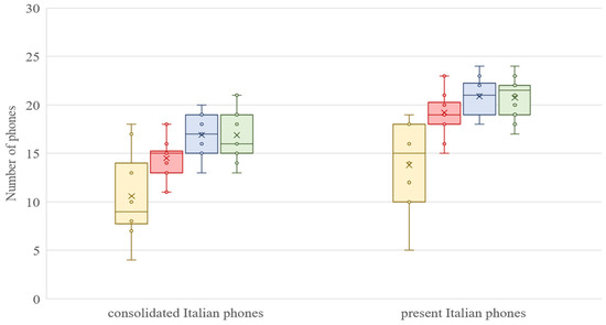 The results reveal that the average number of phones increases as a function of the children’s age, while concomitantly, the intersubject variability decreases (Figure 1). This is true for both the number of all the allophones (including the phones extraneous to the Italian phonological system) divided by the age group (Figure 1, right side), as well as for the number of Italian phonemes, exclusively (Figure 2). While there seems to be no substantial difference between the two figures, both show that the age range between 36 and 41 months (the third group) evidences a point of arrival because the increase has an alt, with the fourth and last group performing at the same level of the third.