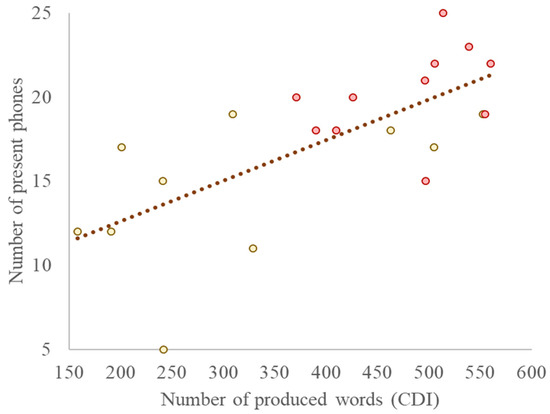 Correlation between the size of Phonetic Inventory and the size of the expressive vocabulary. The former is represented on the vertical axis in terms of the number of present phones (Italian and non-Italian phones classified as consolidated and attested), while the latter is represented on the horizontal axis in terms of the number of produced words according to the PVB report. Each data point represents a participant, i.e., the yellow dots represent those belonging to the 24–29 month range (N = 10), while the red dots represent those belonging to the 30–35 month range (N = 14).