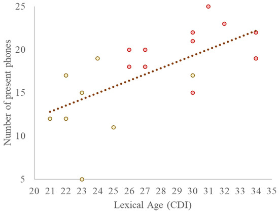 Correlation between the size of Phonetic Inventory and the Lexical Age of the children. The former is represented on the vertical axis in terms of the number of present phones (Italian and non-Italian phones classified as consolidated and attested), while the latter is expressed in months on the horizontal axis. Each data point represents a participant, i.e., the yellow dots represent those belonging to the 24–29 month range (N = 10), while the red dots represent those belonging to the 30–35 month range (N = 14).