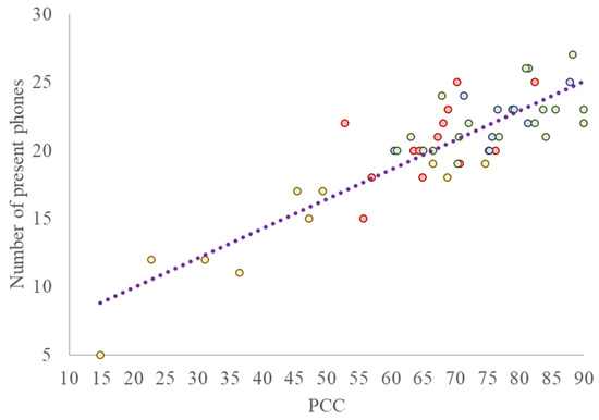 Correlation between the amplitude of Phonetic Inventory and the PCC. The PhI is represented on the vertical axis in terms of the number of present phones, i.e., the phones classified as consolidated and attested, belonging to and extraneous to the Italian phonological system. The colors of the dots correspond to those used for the previous graphs, i.e., the yellow dots represent the 24–29 month range, the red dots represent the 30–35 month range, the blue dots represent the 36–41 month range, and the green dots represent the 42–47 month range. The dotted line represents the linear correlation across the whole sample.