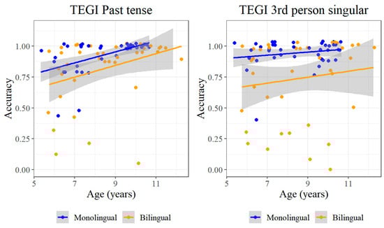 For morphology, we used the Test of Early Grammatical Impairment (TEGI; ) to assess children’s production of the third person singular and regular and irregular past-tense morphology in English via elicitation. In particular, the TEGI assessment uses picture elicitation probes requiring participants to produce sentences using words with the target morphological features.