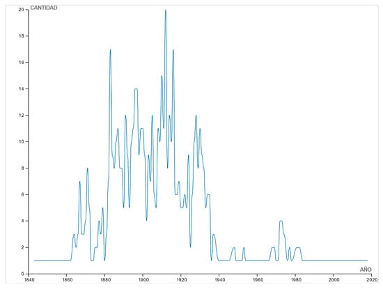 To study Q/N.Cxns, examples from two different corpora have been retrieved: the Corpus del Diccionario Histórico (CDH), compiled by the Spanish Academy of Language (RAE) (https://www.rae.es/banco-de-datos/cdh [accessed on 1 January 2025]), and the Biblioteca Virtual de Prensa Histórica (BVPH), compiled by the Spanish Ministry of Culture (https://prensahistorica.mcu.es/es/inicio/inicio.do [accessed on 7 January 2025]).