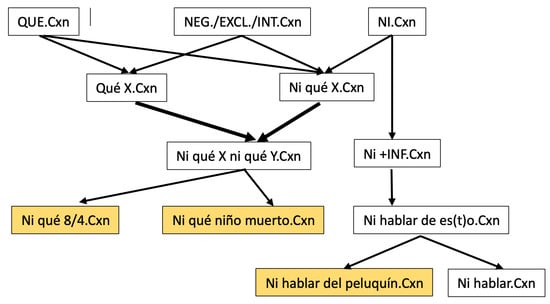 An important feature of CxG is the possibility of establishing links among constructions. In this sense, (1) and (2) are complex constructions, conceived as the merger of simpler constructions. To properly understand (1) and (2), vertical and horizontal relationships have to be established. Along the vertical axis, higher-level (EXCL.CNX, INT.CXN, NEG.CXN, or INSUB.CXN),medium-level (NI.CXN, QUÉ.CXN) and lower-level constructions (ni qué historias, ni qué cojones—) are taken into account (See Section 5.1 for a discussion on the types of relationship linking these different levels).