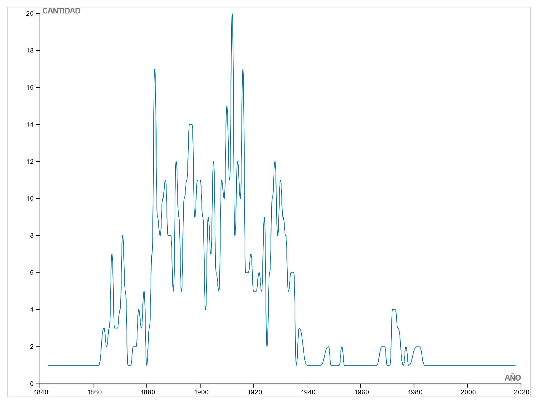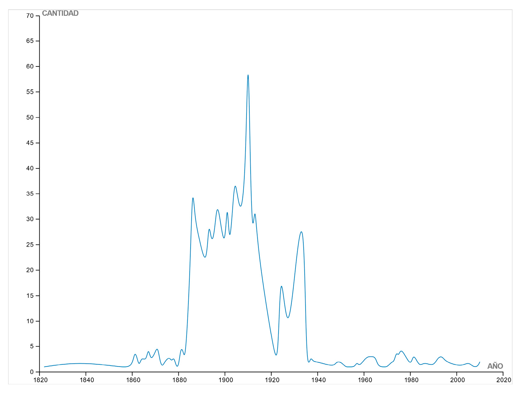 Ni hablar de eso is documented 203 times in the BVPH, peaking around 1930, with most occurrences between 1950 and 1980, as shown in