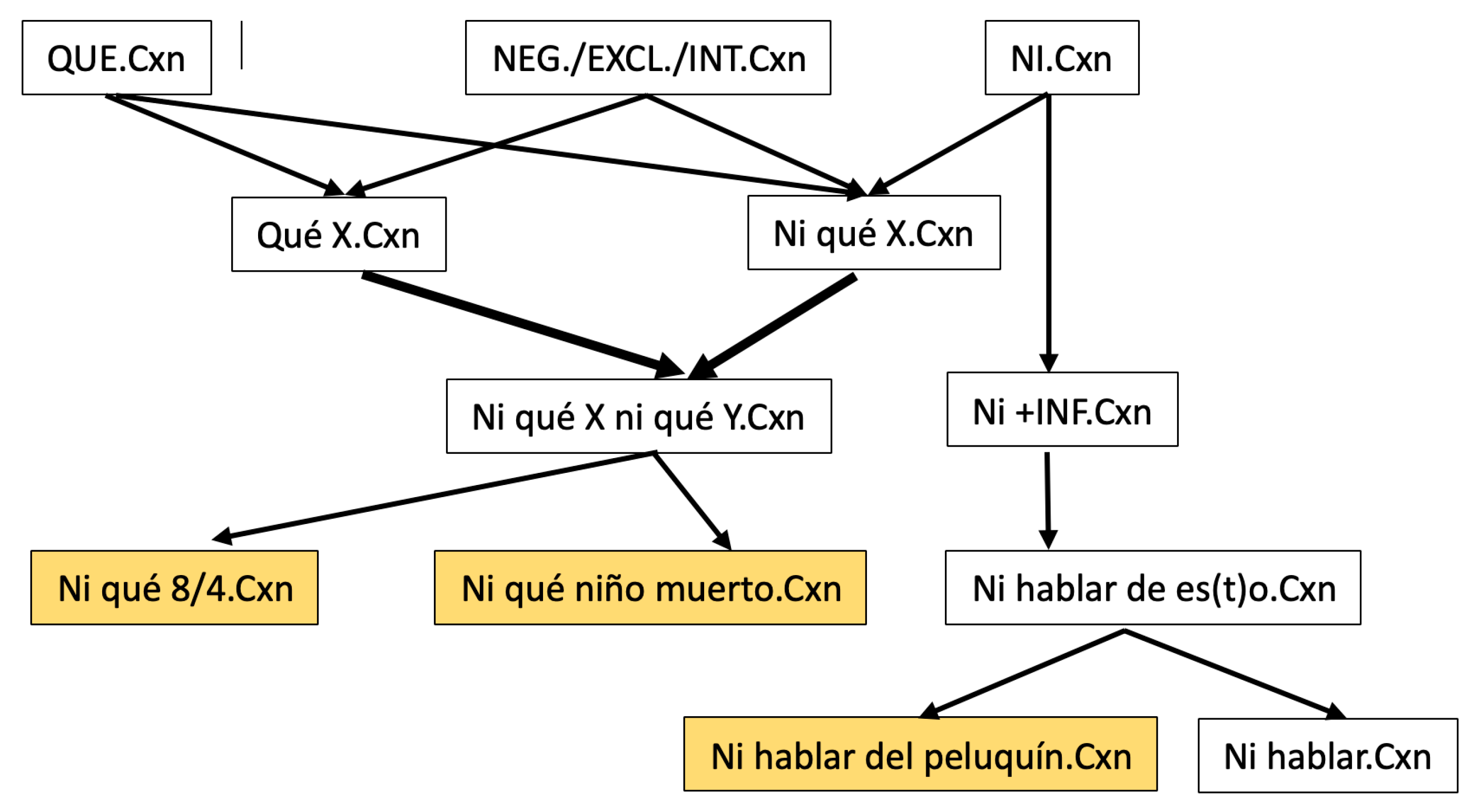 For a more comprehensive account, further constructions should be studied, such as ni hablar (de eso), ni loco, or ni que Vimp.subj.Cxn (ni que fuera X, ni que hubiera X, etc.). Due to time and space restrictions, the explanation is limited to the most deeply entrenched constructions. Future research will provide a more complex view of the extended family of constructions.