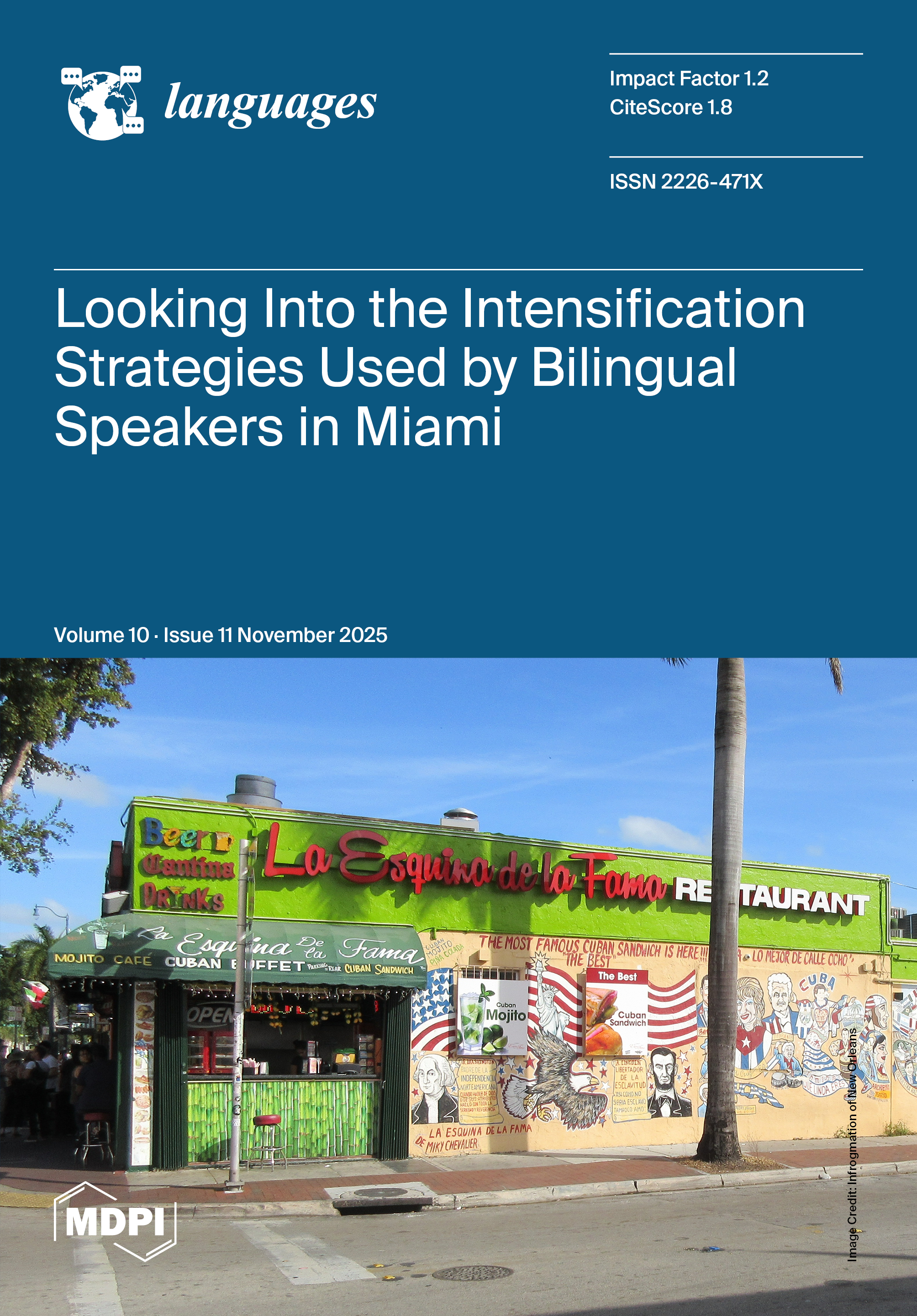 Cover Story (view full-size image): Situations of language contact can result in various outcomes. It is important to study various types of contact situations in order to better understand which factors contribute to the ways in which these outcomes concretely manifest in language. This study investigates the contact effects of codeswitching and linguistic convergence in the speech of the English–Spanish bilingual community of Miami, making use of intensification as a testing ground. Intensification constitutes an analytic–synthetic conflict site between the grammars of English and Spanish with regard to the concrete strategies preferably used in both languages. In settings of bilingual language use and codeswitching, it is of interest to observe which intensifying strategies speakers use when they have two diverging systems of intensification at their disposal. View this paper