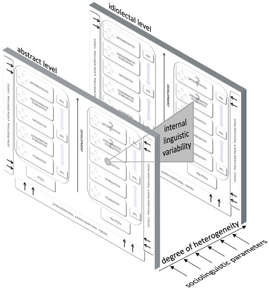 The Extra- and Intra-Territorial Forces (EIF) Model builds on two earlier conceptual frameworks, viz. Schneider’s (2014) notion of “Transnational Attraction” and the Dynamic Model. The notion of “Transnational Attraction” conceptualizes English as an attractor for both individuals and communities, who learn and use it “‘as an economic resource’ (Kachru, 2005, p. 91), a symbol of modernity and a stepping stone toward prosperity” and tries to capture “the [resulting] appropriation of (components of) English(es) for whatever communicative purposes at hand, unbounded by distinctions of norms, nations or varieties” (Schneider, 2014, p. 28). Roughly along the developmental lines of the Dynamic Model, the EIF Model assumes various forces to operate within and beyond national confines and to affect and strengthen the role and status of English in specific regions or under specific usage conditions. Such forces include, for example, language policies and language attitudes, globalization and acceptance of globalization, foreign policies, and the effect of the sociodemographic background of a region, and of course colonization and attitudes towards the colonizing power. Further forces have been added to this list in applications of the EIF Model to different non-postcolonial but also postcolonial case studies (cf. Buschfeld & Kautzsch, 2020). In the original 2017 publication, Buschfeld and Kautzsch postulate that non-PCEs, too, evolve in a more or less uniform fashion—both when compared to each other but also when compared to PCEs (cf. Schneider, 2007, p. 21, general assumption for the development of PCEs). Buschfeld (2020b) presents an update to the model, which is illustrated in Figure 1. Figure 2 constitutes a three-dimensional version of the EIF Model, taking into account the internal linguistic heterogeneity found in many varieties of English.