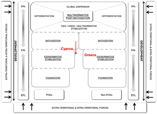 As has repeatedly been pointed out in recent years, the categories ESL/Outer Circle and EFL/Expanding Circle should not be considered as clear-cut as traditionally assumed. Consequently, recent research has made first attempts for an integrative approach to Englishes traditionally ascribed to one of these categories. The paper at hand introduces the Extra- and Intra-territorial Forces Model (EIF Model) as a successful attempt to bridge the traditional gap between the two categories and shows how the model works in practice by implementation to the cases of Greece and Cyprus. These two countries are particularly interesting for the application of this framework since their linguistic ecologies, with Greek and English in contact, are essentially similar. From a historical perspective, however, they are fundamentally different; Cyprus is a former colony of the British Empire, whereas Greece has never experienced British colonization. Therefore, the two countries offer the perfect basis for putting the traditional categories of EFL and ESL to the test and for illustrating how more recent models of World Englishes, such as the EIF Model, might offer more flexible theoretical alternatives to earlier, often more rigid theoretical approaches.