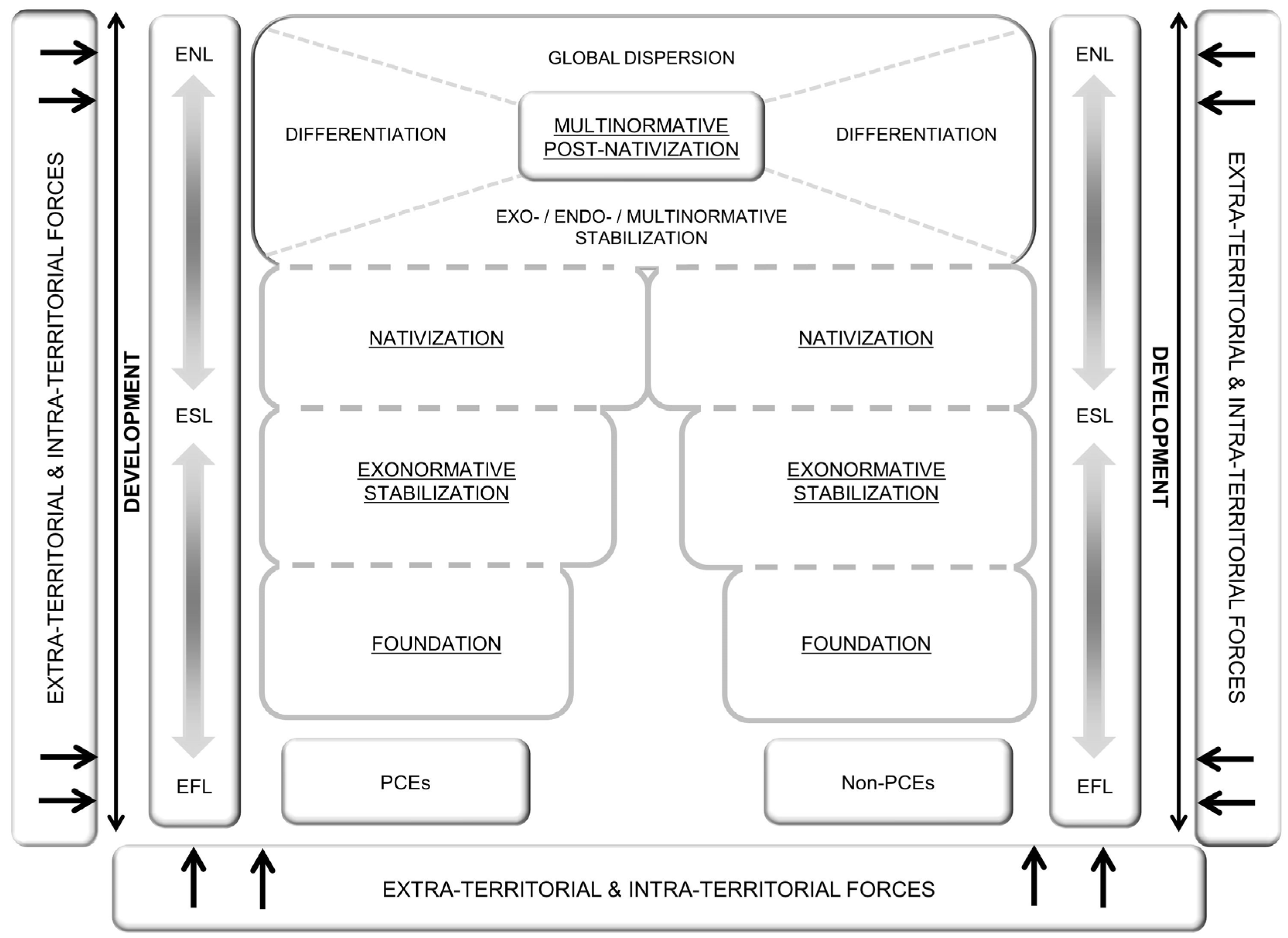 - A lack of settler strand and external colonizing power in non-PCEs, which have exerted political, social, and linguistic influence on the (former) colony from the outside; this mainly affects the applicability of phase 2, Exonormative Stabilization, of the Dynamic Model;