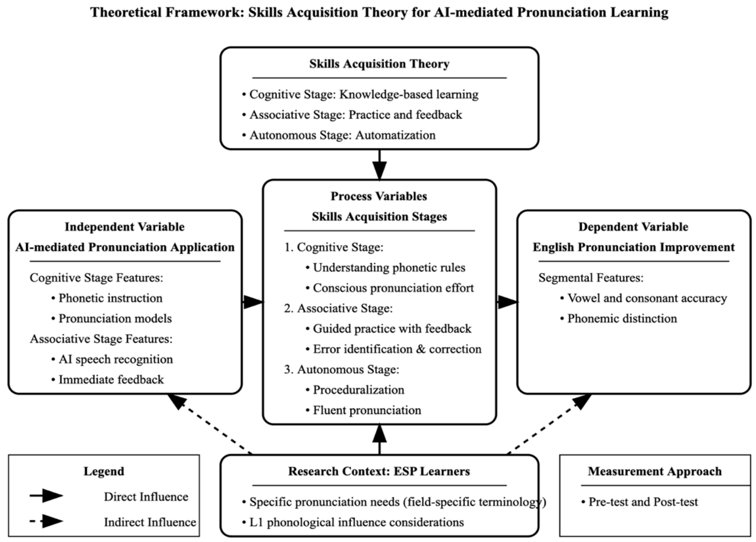 In this study, Skills Acquisition Theory (SAT) was applied as the theoretical underpinning for investigating how AI-mediated pronunciation applications can improve English pronunciation among ESP learners. Skills Acquisition Theory posits that skill development progresses through three distinct stages: the cognitive stage (where learners acquire declarative knowledge about pronunciation rules), the associative stage (where knowledge transforms into procedural form through practice and feedback), and the autonomous stage (where pronunciation becomes automatized and requires minimal conscious effort). Consequently, this study employs this theory (SAT) because its structured stages align well with the process by which AI-mediated applications facilitate progressive improvement in pronunciation skills. It is believed that this application would offer targeted feedback and practice to ESP learners.