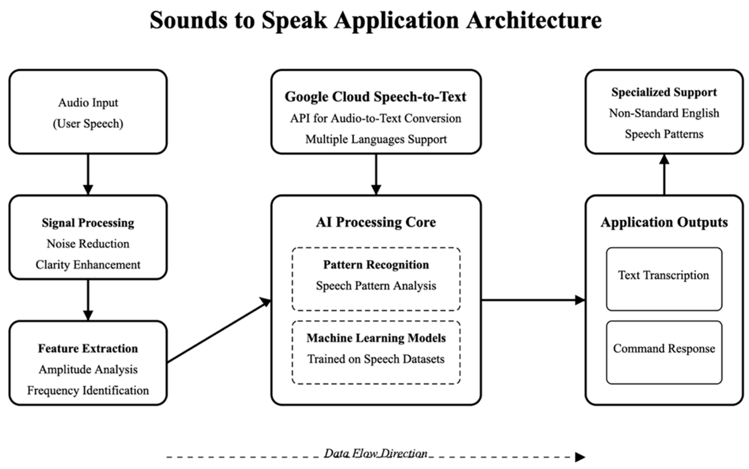 The application was collaboratively developed by the lead researcher, who designed the pedagogical framework, selected linguistic content, and conducted the learner needs analysis, and a programmer, who was responsible for implementing the user interface, integrating the automatic speech recognition (ASR) engine, and optimizing system feedback algorithms. The following diagram (Figure 2) indicates the architecture of automatic speech recognition of this current study.