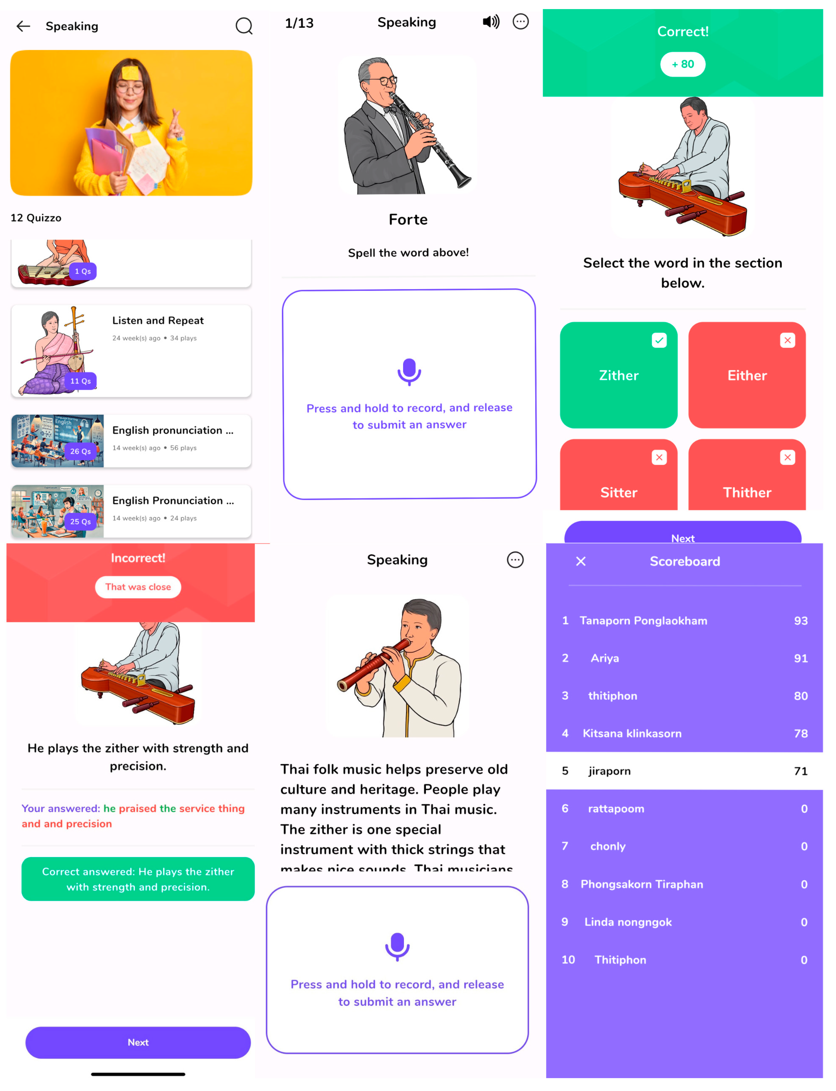 The application was selected based on a comprehensive evaluation of available technologies, with particular attention to its capacity to address the specific pronunciation challenges faced by Thai learners of English. Prior to implementation, the application’s speech recognition accuracy was tested with a sample of Thai speakers to ensure its appropriateness for the target population. This application was available only on iOS devices. The interface employs a systematic color-coding scheme to facilitate learning: green backgrounds and buttons indicate correct pronunciation responses, red backgrounds signal incorrect attempts with specific error identification, and purple elements denote navigational functions and the competitive scoreboard feature. The microphone symbol prompts learners to record their pronunciation, while speaker icons provide access to English speaker models. Figure 3 demonstrates the overview of the application’s features.