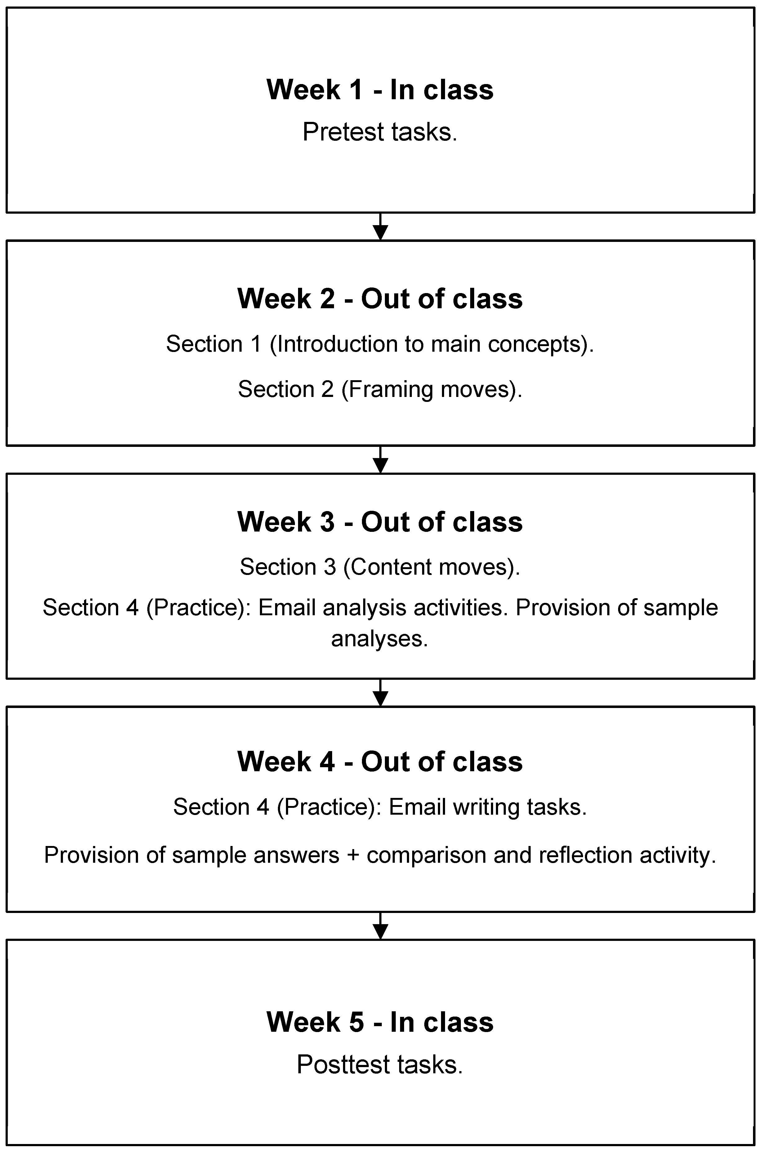 | Organization Refers to the presence/absence of framing moves (a subject line, salutation, opening, body and closure) and of a general structure that facilitates identification of key information. | Contains all necessary framing moves. Clear structure. Facilitates finding information in the email. | Most framing moves are present. Clear structure. | Some framing moves are missing. Lacks some structure. | Most framing moves are missing. Mostly lacks structure. It is difficult to find key information in the email. | No clear framing moves. No clear structure. |