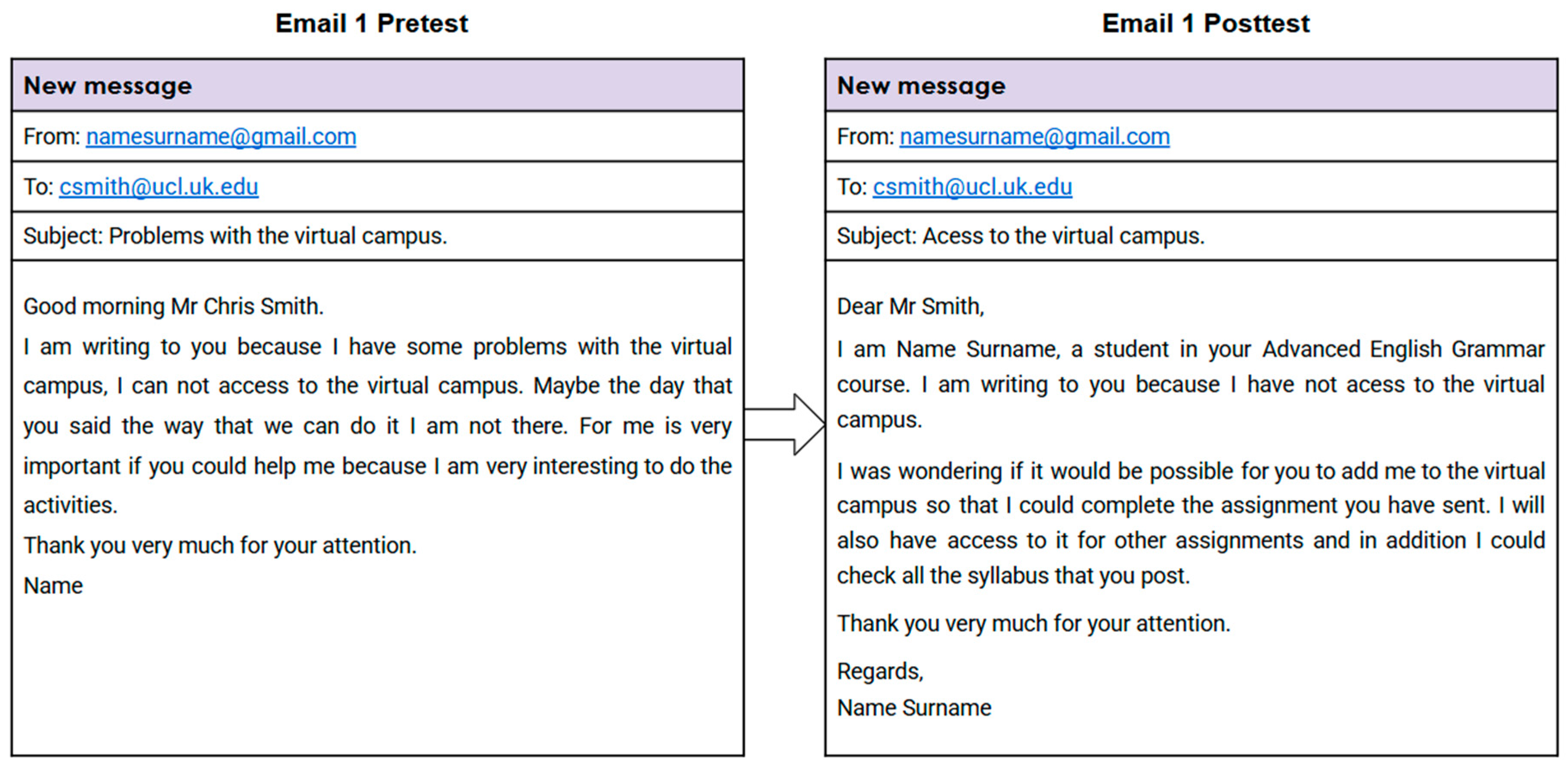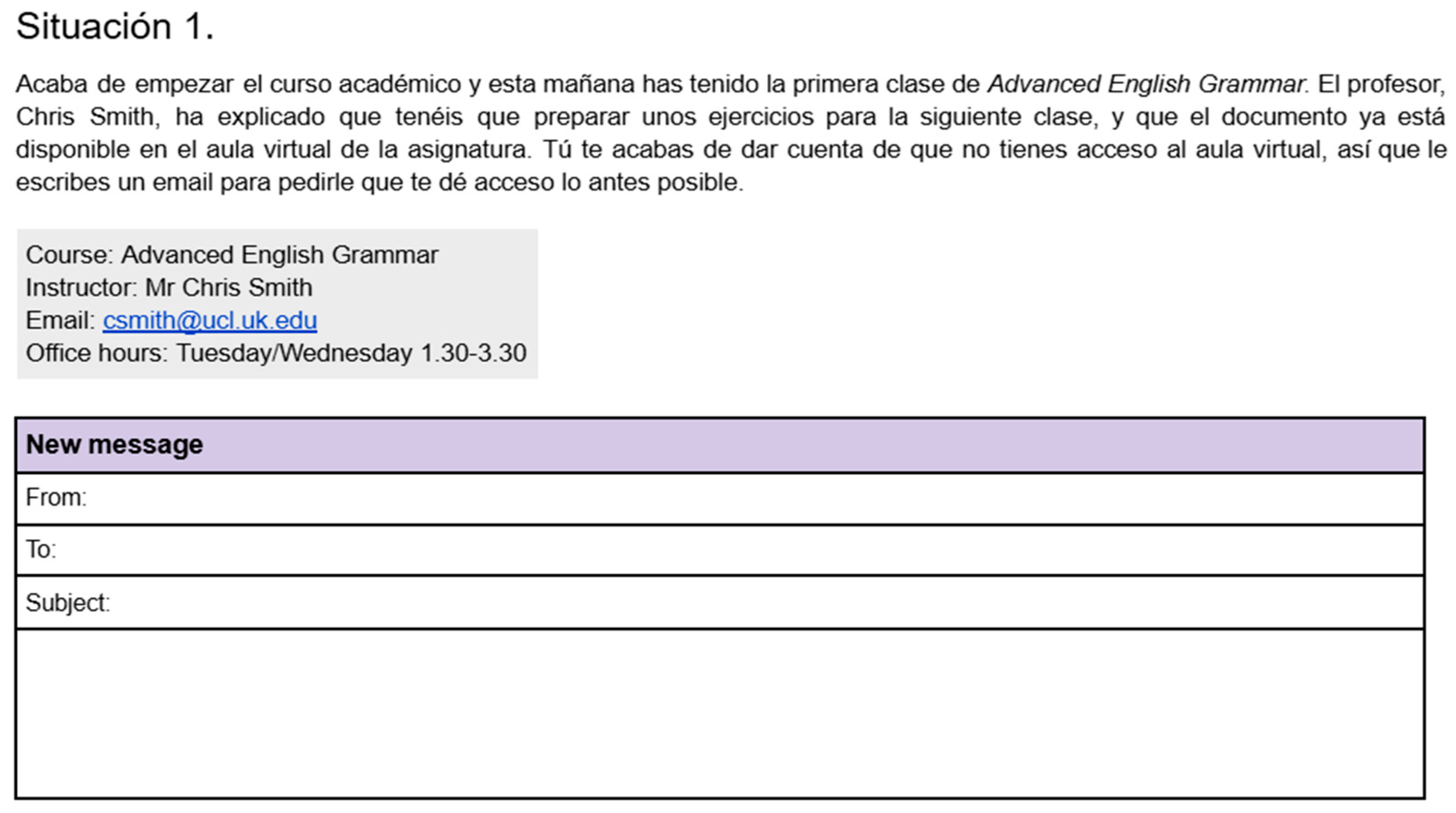 - The academic year has just started, and this morning you had your first Advanced English Grammar class. The lecturer, Chris Smith, has explained that you need to prepare some exercises for the next session, and that the file is already available on the course online learning platform. You’ve just realized that you don’t have access to the learning platform, so you decide to write an email to ask them to grant you access as soon as possible.