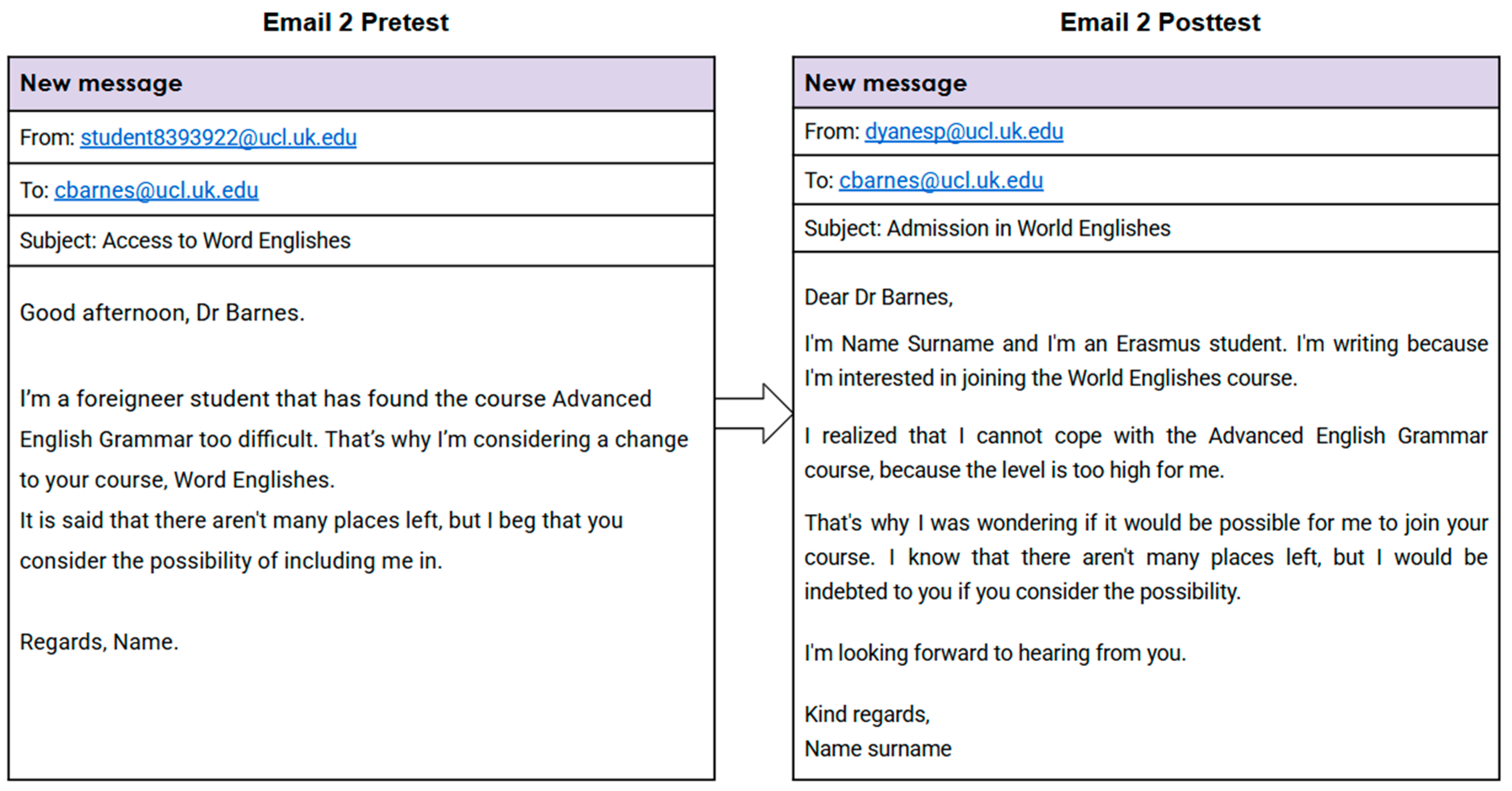 - After attending several sessions of the Advanced English Grammar course, you realize that the level of difficulty is very high and that passing the class will be challenging for you. You would like to request a change of course and enroll in World Englishes, which seems very interesting. Since the class is already quite full, you have been told that you need explicit permission from the lecturer, Cathy Barnes, in order to transfer. You decide to write an email to the professor, whom you don’t know, to request her permission.