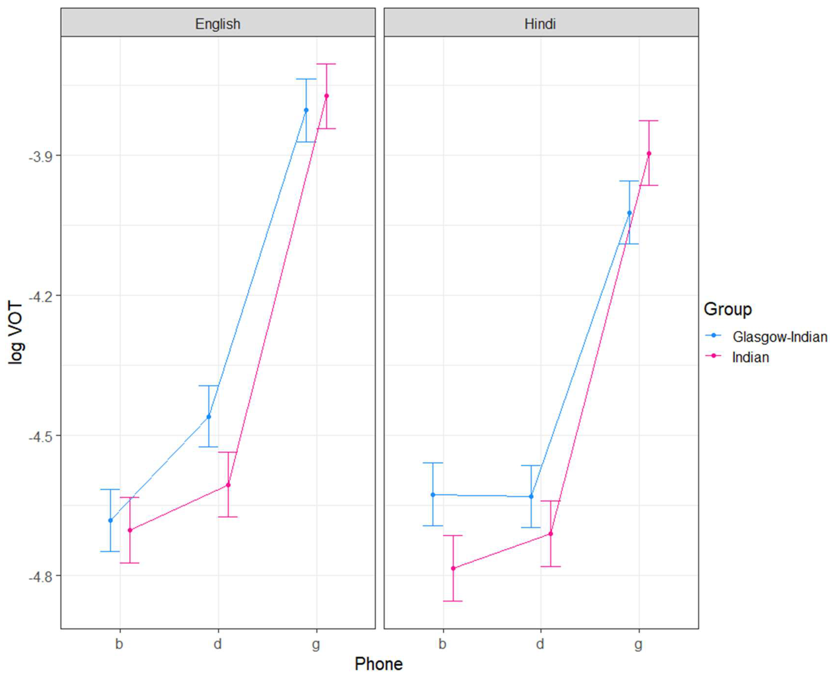 Figure 1. Interaction effect between group, phone, and language on log VOT in /b d g/ for Glasgow Indians and Indians.