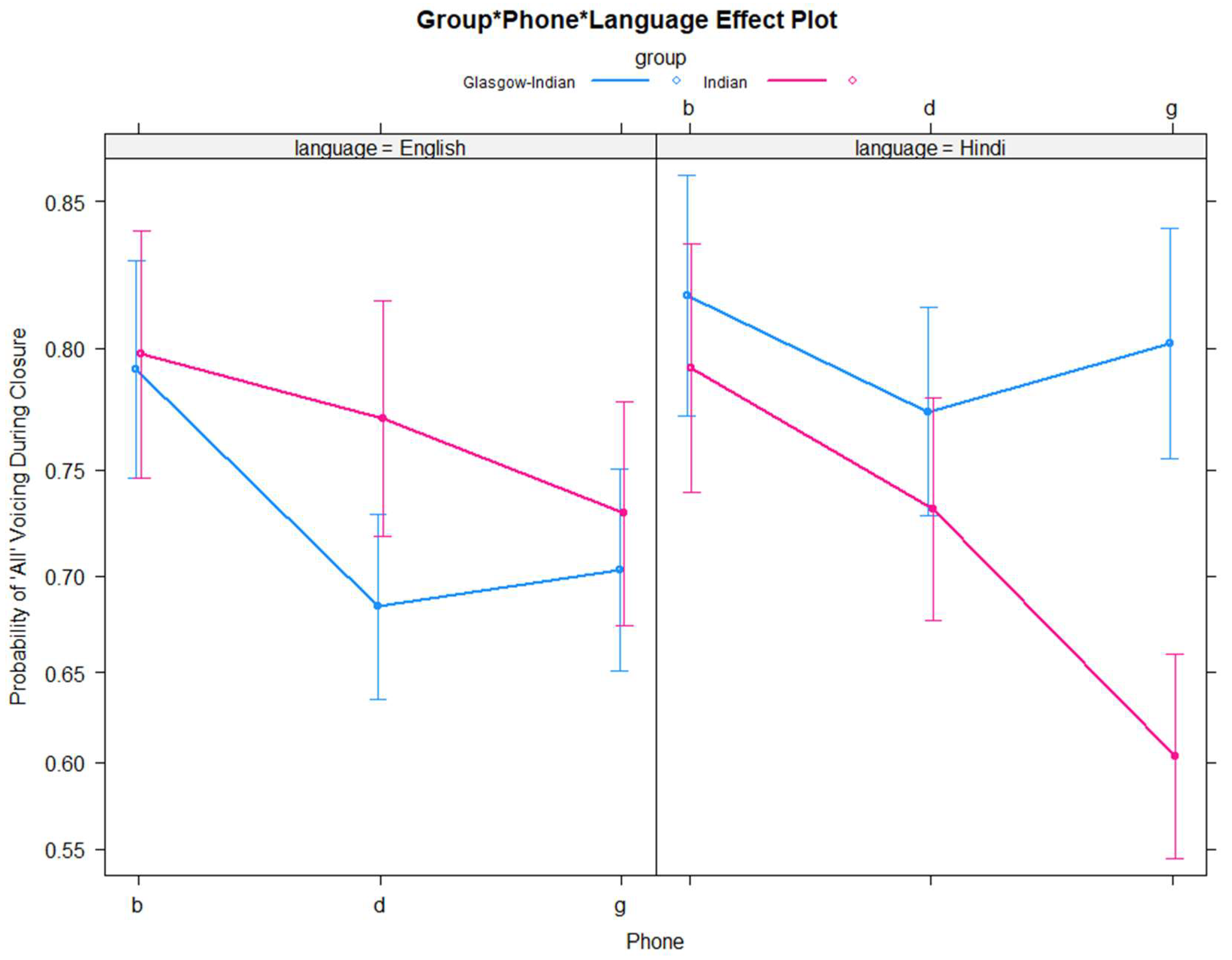 To summarize, in English, Indians and Glasgow Indians had similarly higher probabilities of having ‘all’ VDC (that is, fully voiced closures) for all three stops, whereas Glaswegians had a probability lower than 0.5 of having ‘all’ VDC (therefore, a much lower likelihood of fully voiced closures) for all three stops. In Hindi, both Glasgow Indians and Indians were equally likely to have ‘all’ VDC (that is, fully voiced closures) in /b/ and /d/. However, Glasgow Indians had a significantly higher probability of having full VDC for /g/ than Indians. This is evidence of dissimilation for /g/ in Hindi, in that this stop is more voiced in the Hindi of Glasgow Indians than in that of Indians.