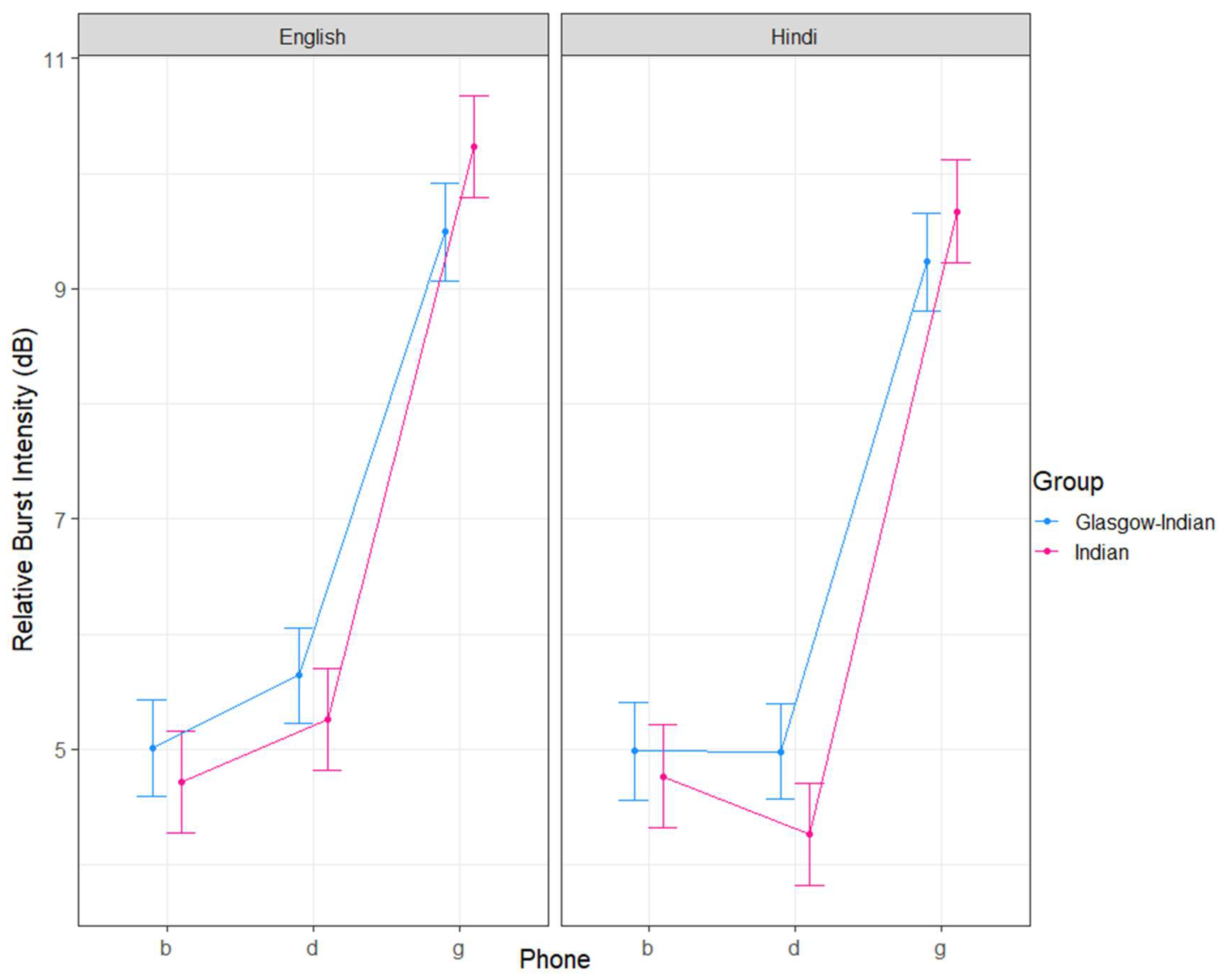 Previous research has shown that speakers’ linguistic background can influence burst intensity. For instance, Shaktawat (2018) found that native Glaswegian English speakers produced less intense bursts compared to Pakistani heritage speakers in Glasgow, whose English showed influence from Urdu and Punjabi. This pattern aligns with prior observations in Shaktawat (2024): Glaswegian English voiced stops showed lower RBI than Indian English stops produced by the Indian control group in India for /b/ and /d/. However, in contrast to this trend, Glaswegian English /g/ showed higher RBI than that of the Indian control group. Kirkham (2011) also reported that coronal stops (/t/ and /d/) in British Asian English can exhibit higher burst intensity than the equivalent stops in standard British English.