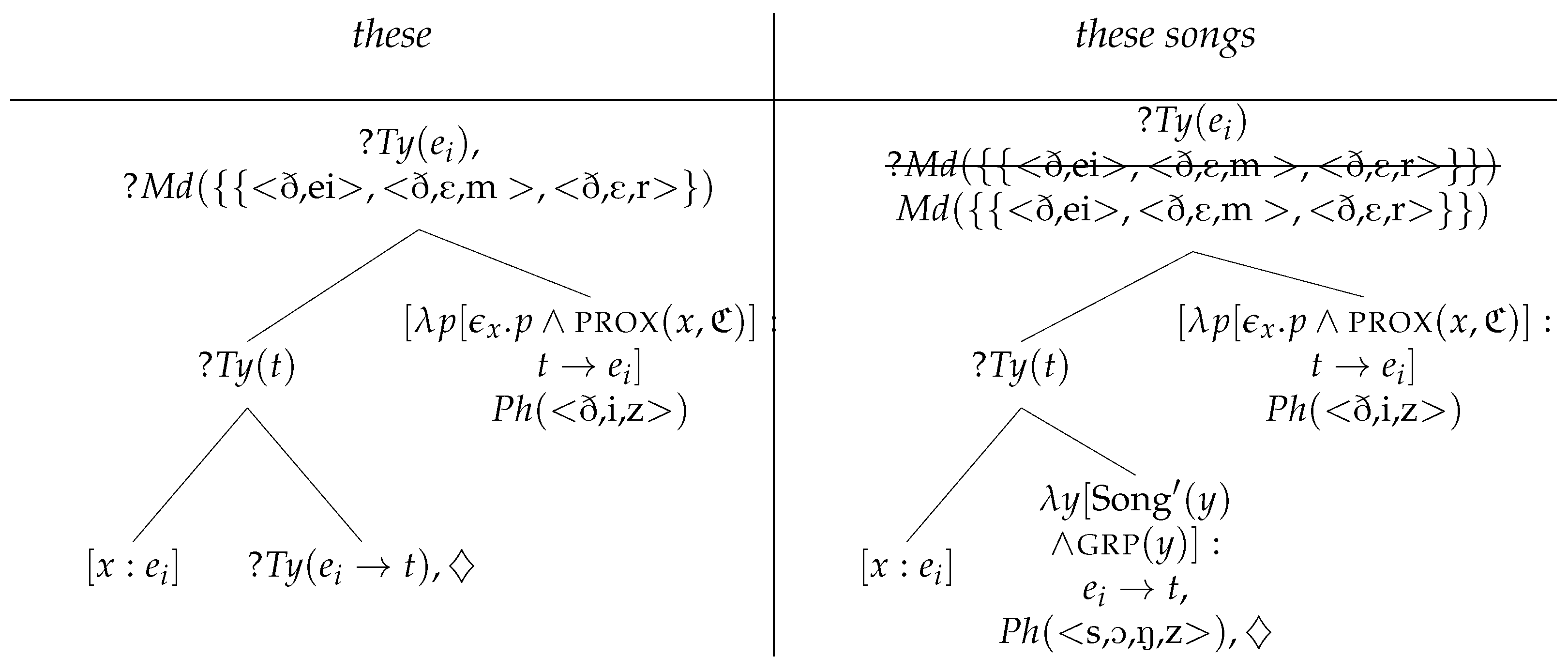 Notice that the relation between the values is one of non-empty intersection, not identity. This is because words like dog, bull, and ship mentioned above carry an value that covers more than one set of potential anaphoric forms. So cow projects ʃ,ih,ə,rɪ,tɪ,t,s, which needs to match both feminine (ʃ,ih,ə,r) and neuter (ɪ,tɪ,t,s) pronouns. The rule of Substitution in (16) ensures that the pronouns in (13) are paired with the appropriate antecedents under the following assumptions: the referent of Mike is, for the speaker, male, and so the word is associated with h,ih,ɪ,mh,ɪ,z as is the pronoun he; the speaker’s intended referent for Jean is female and so associated with ʃ,ih,ə,r as is she; and plural noun phrases like the daffodils and forms of the third person plural pronoun are associated with ð,ɛ,ið,ɛ,mð,ɛ,r. Given that the requirement for values on anaphors and antecedents have a non-null intersection, no other construal is possible.