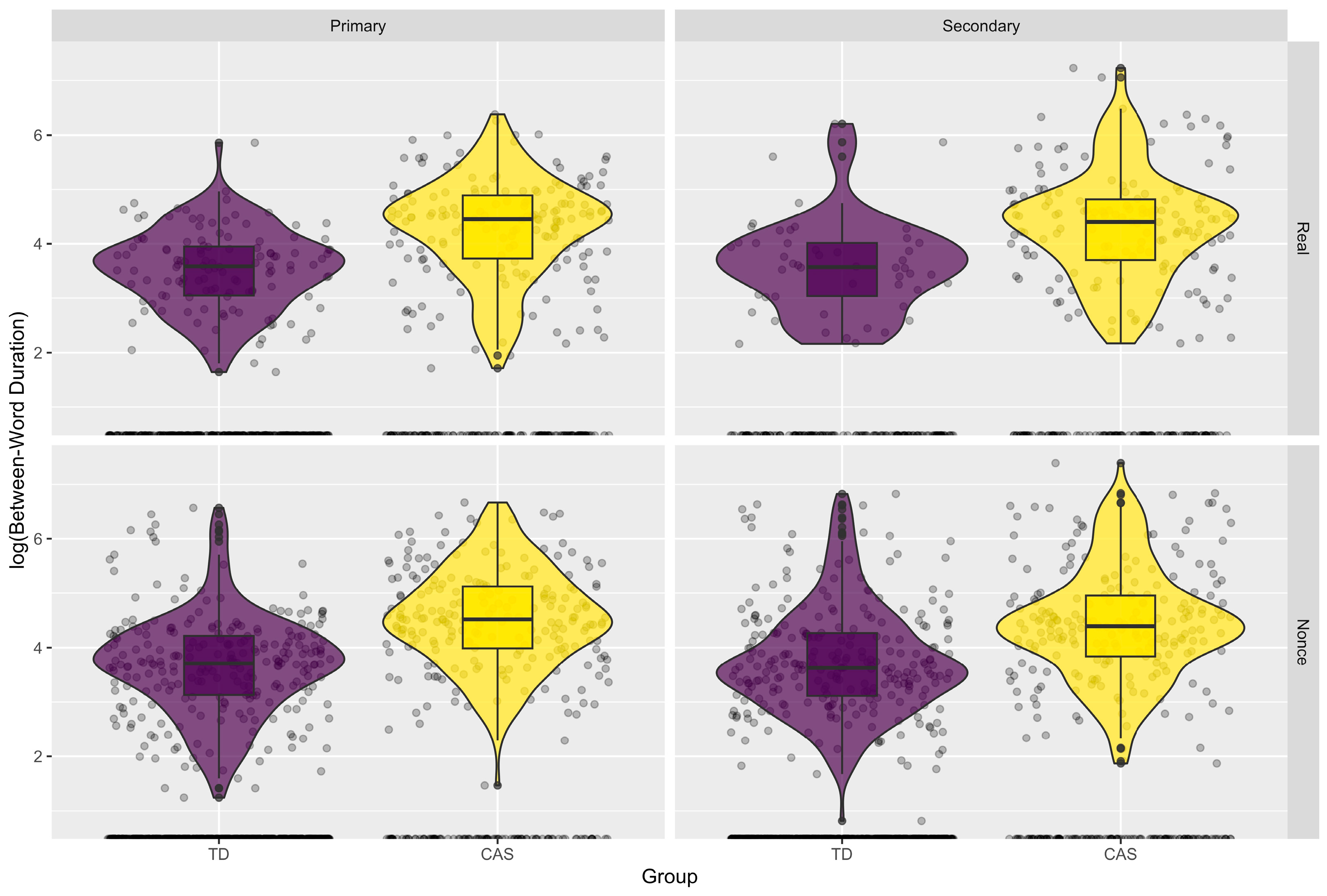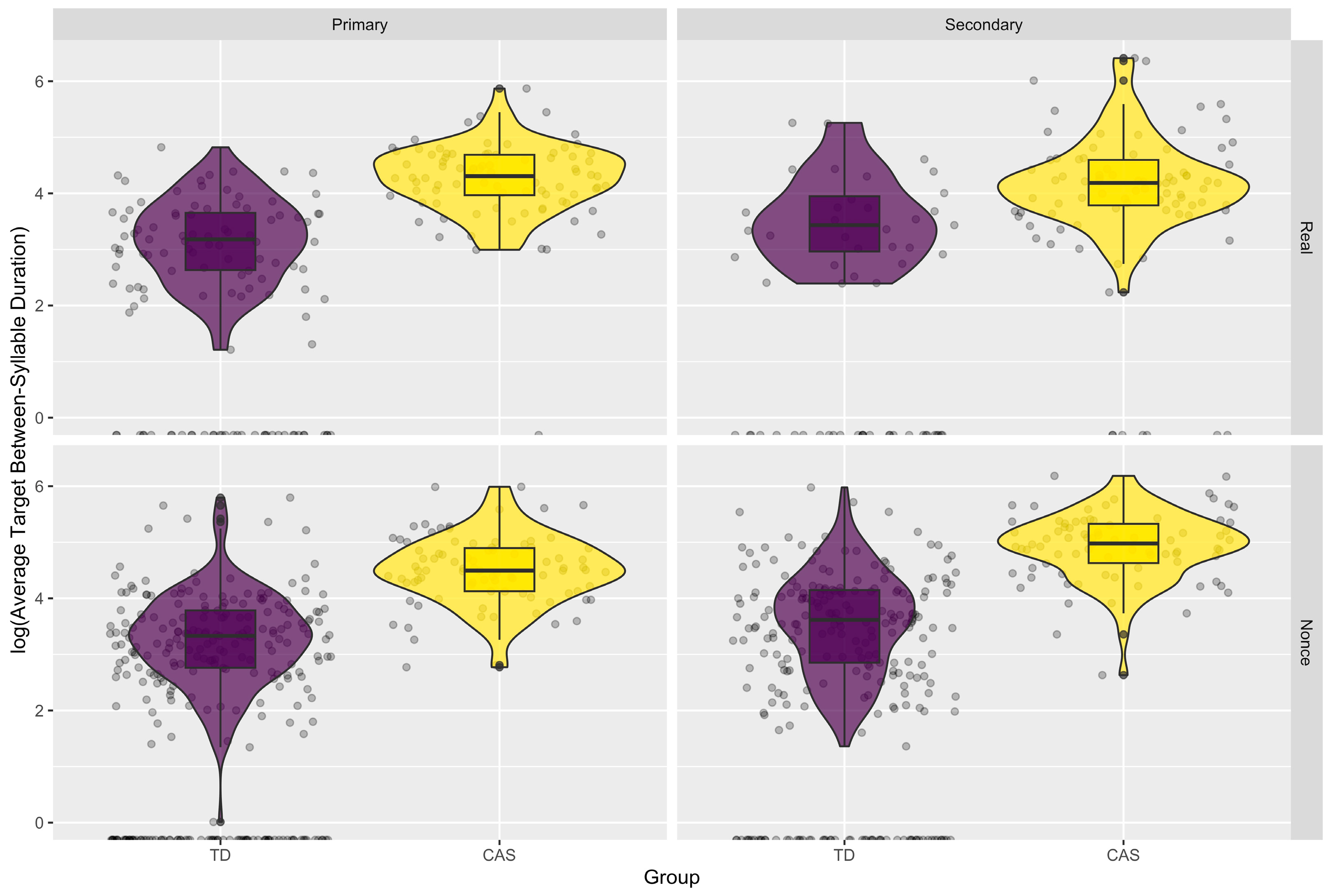 Wright et al., 2009). Based on this literature, we predict that children with CAS will present with significantly longer inter-segment durations between and within words compared to TD children. Additionally, due to the structure of the words utilized from TEMPO
