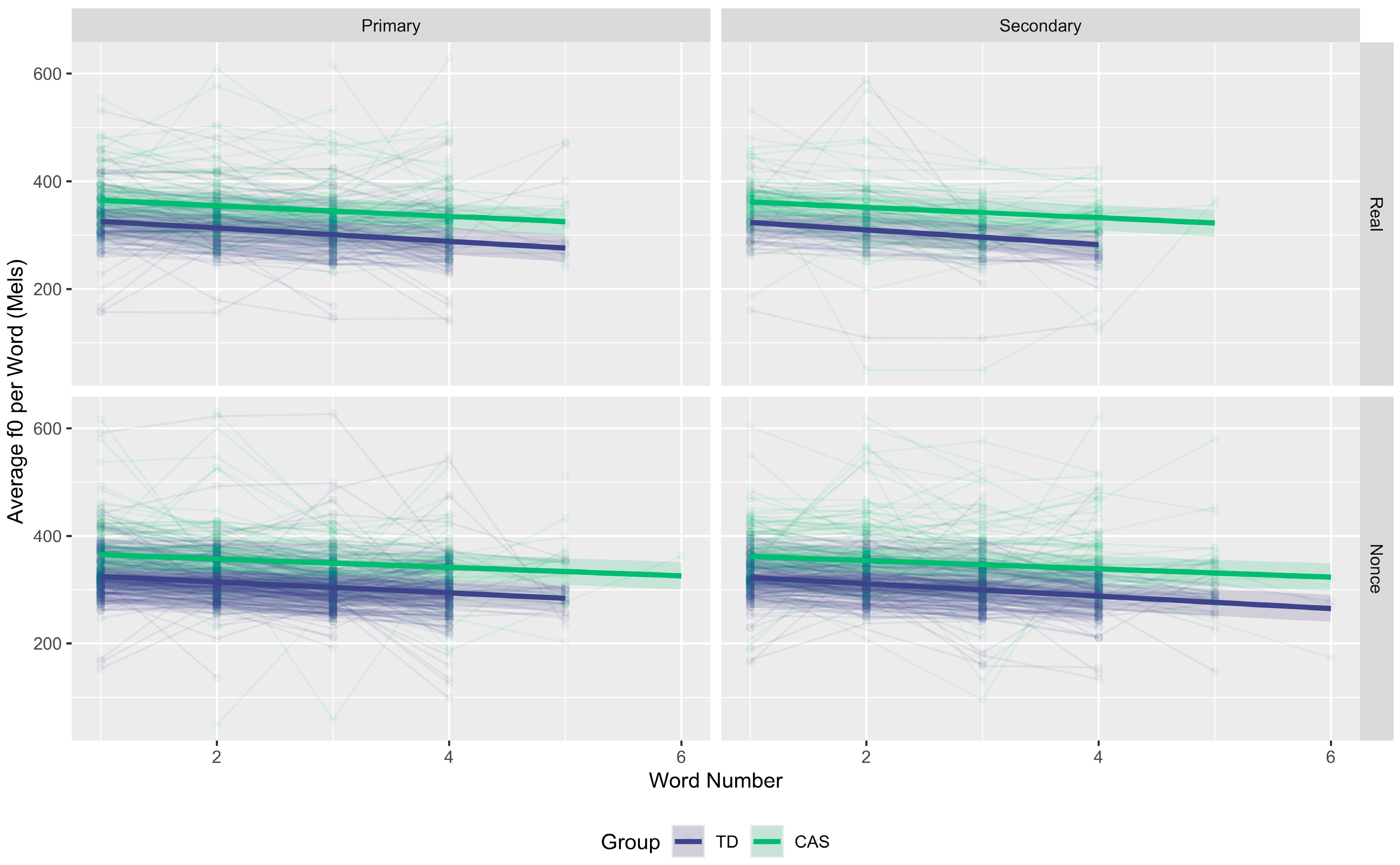 Second, we predict that children with CAS will demonstrate reduced declination compared to TD children, reflected by flatter f0 slopes. If children with CAS engage in reduced prosodic preplanning of utterance-level pitch contours, consistent with speech motor control accounts of reduced feedforward control (