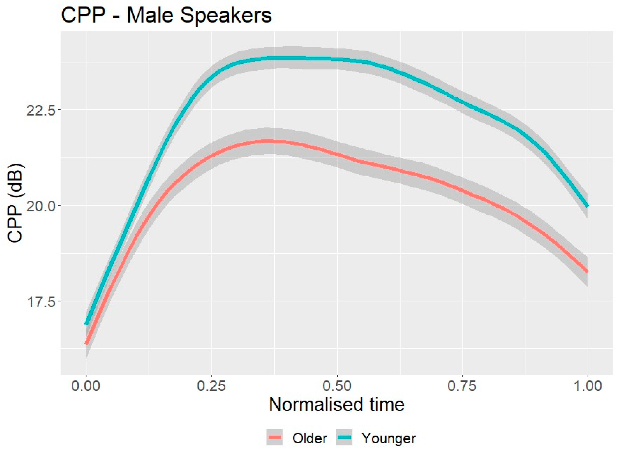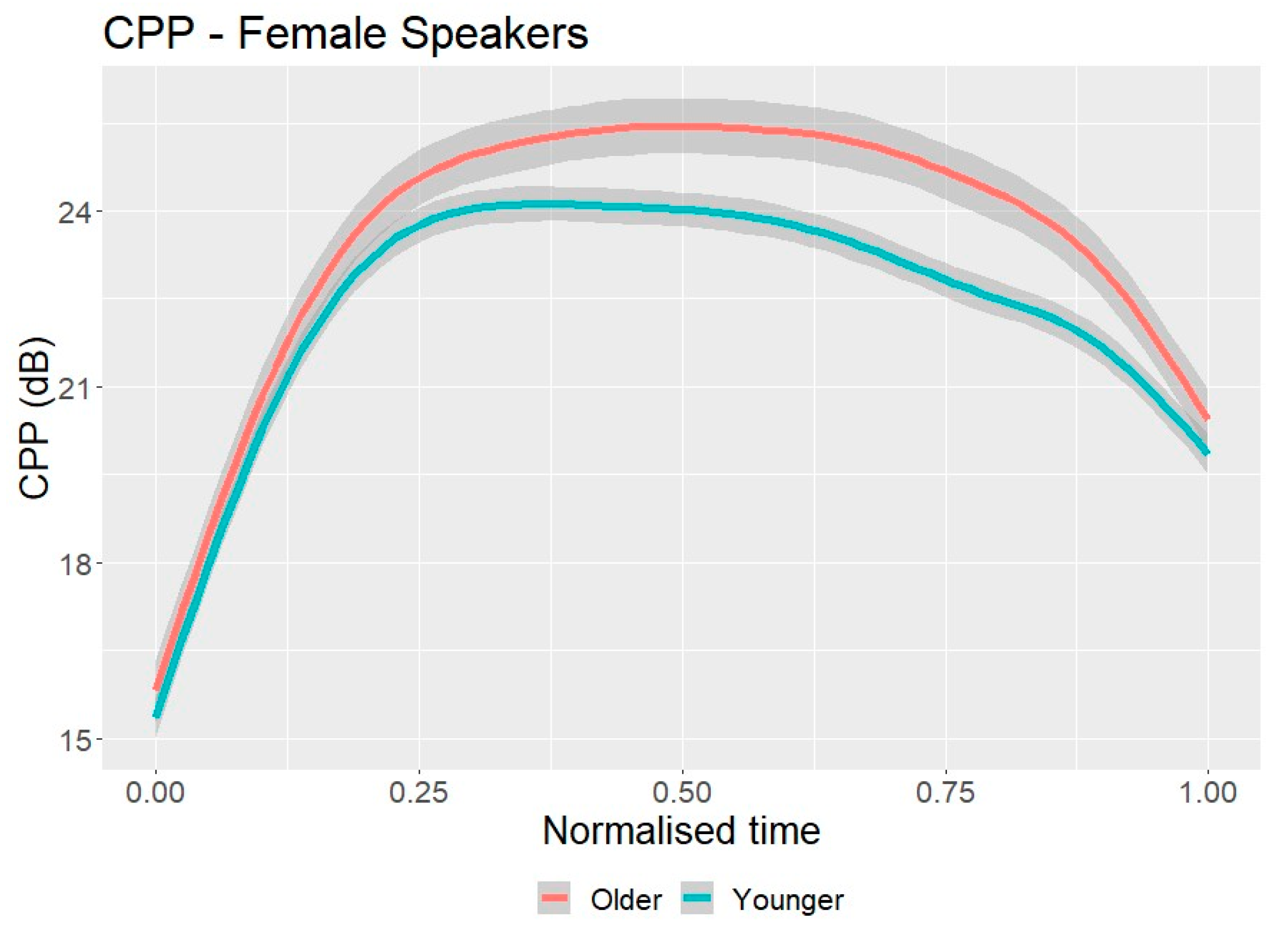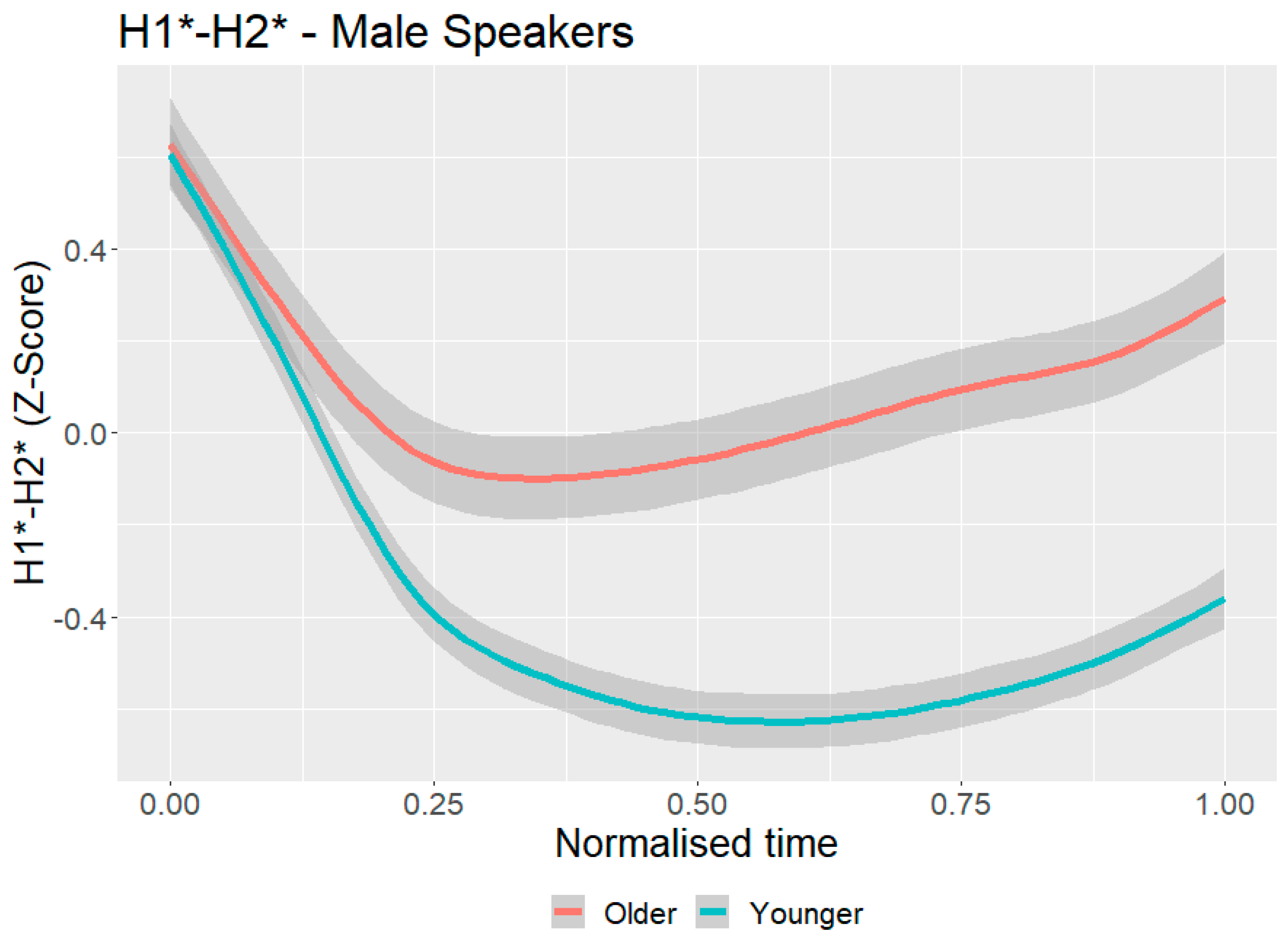 geom_smooth(aes(group=labels,randomid=factor(sl_rowIdx)), meth-od="gam",formula=y~s(x, bs="cs") + s(randomid, bs="re"))where “cs” is a cubic regression spline and “re” is a random effect grouping by track number (randomID). This required a custom wrapping function mgcv::gam() to be inserted into the ggplot2 package, which predicts group trajectory based on the random effects model. This approach was used because samples are not independent, and smoothing procedures should take this into account. One way of achieving this with GAMs is via a random effect. However, random effects are not included when performing smoothing with ggplot2 using default options. Linear Mixed Effects (LMEs) analyses were used on the measures explored, using the nlme package in R (version 3.1-164) (Pinheiro & Bates, 2023; R Core team 2024). Specifically, LMEs were used to analyse vowel formants (F1, F2, and F3) at their acoustic midpoints. For each acoustic measure, LMEs were fitted to examine the effects of age group (younger vs. older), speaker sex (male vs. female), and vowel phoneme, as well as their interactions. Random effects were specified for participant to account for inter-speaker variability. Post hoc pairwise comparisons were conducted using the emmeans package version 1.8.8 (Lenth, 2023) in R, comparing estimated marginal means for age group within each combination of sex and vowel phoneme using the following command:
