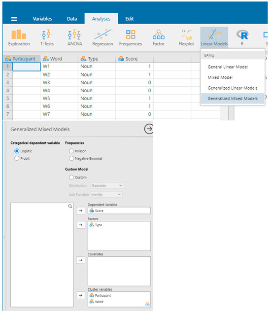 A better analysis for binary dependent variables (consisting of 0 s and 1 s) is logistic analysis (Jaeger, 2008). For this, we select Generalized Mixed Models in gamlj. Everything else remains the same, as shown in Figure 11.