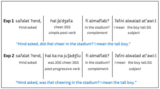 Figure 1 shows an example of an experimental sentence from both experiments. As shown in Figure 1, the experimental sentence starts with the introductory phrase “hind asked”, which makes the sentence-final question pragmatically appropriate. Then, the sentence includes the question marker “hal/did”, which does not contain the number or gender information. After this, the 3SG.M simple past (Exp 1) or past progressive (Exp 2) verb is presented. The verb is followed by a complement, always an adverbial phrase such as “in the stadium”. The complement was added to give participants time to process the verbal number morphology and direct their gaze anticipatorily to the target image (e.g., Garrido Rodriguez et al., 2023; Koch et al., 2023). Finally, the sentence ends with a clarifying statement which includes “I mean”, then the singular subject “the boy”, and the adjective “tall”. The adjective was added to disambiguate the target object in baseline trials, which always presented pairs of identical images: one of a tall boy and one of a short boy (e.g., Koch et al., 2023). The structure of filler sentences was identical to the experimental stimuli per experiment, except for one difference: the fillers only included feminine verbs and subjects to reduce the focus on the masculine verbs and subsequently reduce participants’ attention to the target structure.