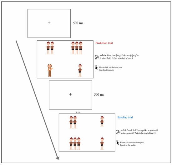 After the trial session, a centrally located fixation point appeared for 500 ms, followed by the simultaneous presentation of the visual display and the auditory stimulus sentence (Figure 3). Participants were instructed to click on the object that was mentioned in the audio. The visual display remained on the screen until participants clicked on the object. A green mark was shown in the bottom center of the screen if participants responded correctly; if not, they saw a red cross mark. When the display disappeared in experimental trials, a fixation point appeared in the center of the screen, indicating a new trial.
