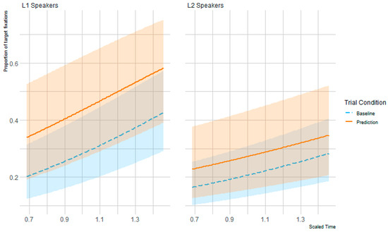 Further, we built logistic LME models using the R package lme4 (Bates et al., 2015) since the dependent variable target fixation is binary (no = −0.5; yes = 0.5). In the main models, the fixed effects included trial type (baseline = −0.5; prediction = 0.5), scaled time (M = 0, SD = 1), group (–0.5 L1 speakers, 0.5 L2 speakers), and experiment (Exp 1 = −0.5; Exp 2 = 0.5). The proficiency models included the same fixed effects except for group, and also added standardized C-test scores (M = 0, SD = 1) and standardized LexArabic scores (M = 0, SD = 1). The maximal random structure justified by the design was initially included for all models (Barr et al., 2013), and only models that converged were reported.