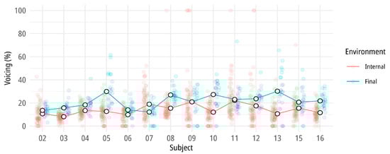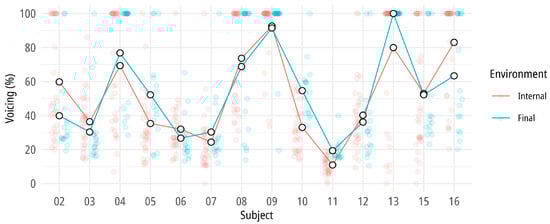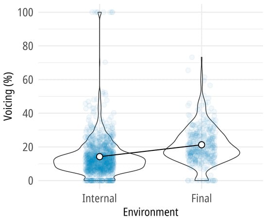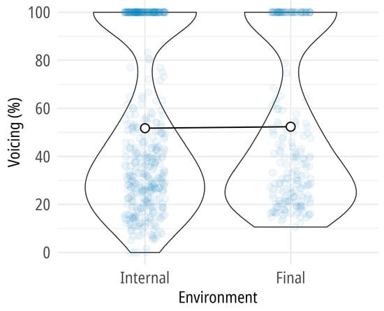 The Spanish pre-sonorant data show that mean voicing of /s/ was below 30% on average both word-internally and finally (see Figure 2 and Table 4). Almost 94% of the internal data contained less than 30% voicing, and around 81% of the word-final tokens had voicing below 30%. There was no word-final /s/ that was fully voiced, and only eight tokens were 100% voiced word-internally, which can be clearly regarded as outliers in the overall distribution. A few tokens were completely voiceless, too, in both positions (7% internally, 5% finally). The means found in this experiment are very similar to what () reported for Hungarian word-final pre-sonorant /s/, which contained around 15% voicing on average. The model that turned out to be the best fitted to the data contained by-subject intercepts and slopes, with the following model structure: lmer(voicing ~ 1 + environment + (1+environment|subject)). According to this model, the fixed effect (environment) is statistically significant; however, it alone does not explain a large portion of the total variance (only 6%); the random effect (subject-specific variability) plays a larger role in explaining the outcome variance (b = 7.066, t(14.004) = 3.825, p = 0.002; R2m = 0.06, R2c = 0.19). Again, it needs to be pointed out that despite the meaningful differences, both group means were below the 30% voicing threshold, rendering the /s/-realizations predominantly voiceless.