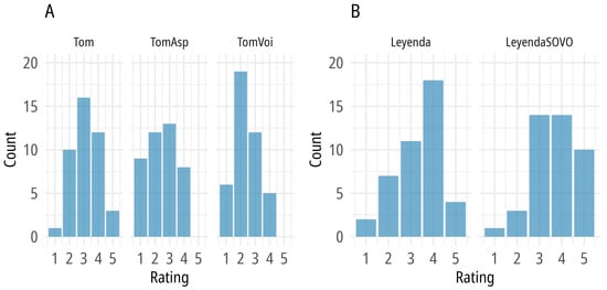 The best-fitting cumulative link mixed-effects model was the one which included stimulus as the fixed effect and by-subject varying intercepts (but not slopes); model structure: clmm(rating ~ stimulus + (1 + stimulus|subject), Hess = TRUE, link = “probit”). According to this model, compared to the native recording, the non-native recordings significantly decreased the ratings, i.e., lower ratings were more likely (TomAsp: b = −1.02, SE = 0.25, z = −4.054, p < 0.001; TomAsp: b = −1.15, SE = 0.26, z = −4.475, p < 0.001; R2m = 0.13, R2c = 0.53). These results indicate that the participants reliably differentiated between the native recording and each of the non-native ones, and that they rated the non-native ones (with either RVA applied or aspiration not applied) much lower. The R-squared values indicate that the fixed effect (stimulus) has a moderate effect size, while subject-related random effects contribute relatively more to the variance. Pairwise comparisons revealed no statistically significant difference between the ratings of the two non-native texts.