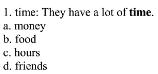 We administered the new Vocabulary Levels Test (McLean & Kramer, 2016) to the first group. This vocabulary assessment tool is a multiple-choice test consisting of 24 questions for each of the first five bands. The test also includes an academic vocabulary section based on Coxhead’s (2000) AWL. Each of the individual items consists of the target word, which is given by itself and in context, along with four possible responses. The examinee has to select the correct response, which can be either a single word or a phrase closest in meaning to the target word (see Figure 1).