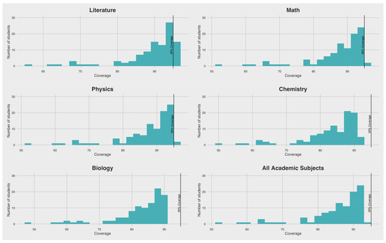 Figure 3 presents a histogram of the vocabulary coverage participants would likely know for each corpus. The data reveal that most EAL participants lack the vocabulary needed to read discipline-specific textbooks, with biology and chemistry being the most challenging subjects and maths and literature the easiest. Given the vocabulary levels displayed by EAL learners, even at the Grades 11 and 12 level, we expect them to struggle to fully comprehend the textbooks used in their classes.
