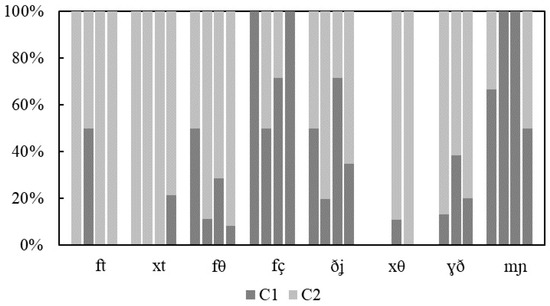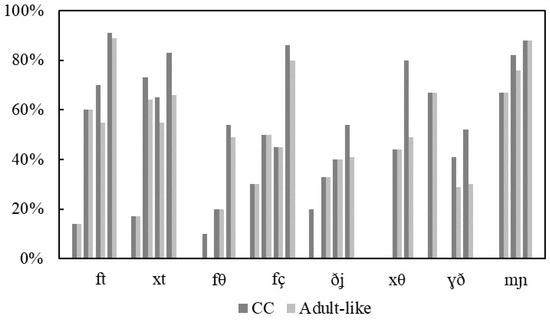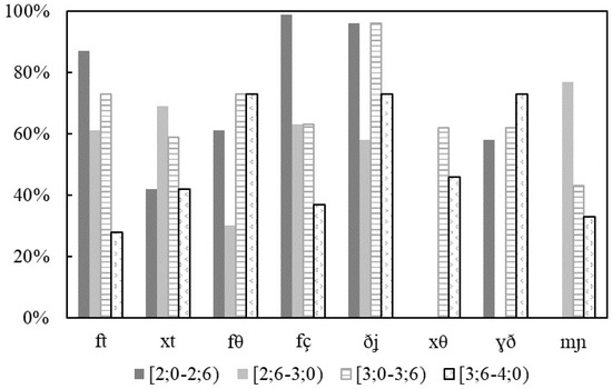 The measures of two-member productions and adult-like productions can be considered as having no statistically significant difference as attested by the chi-squared results per cluster across age groups, as well as per age group across clusters. Per cluster across age groups: [ft]: χ2 = 0.216, p = 0.642, d.f. = 2; [xt]: χ2 = 0.04, p = 0.850, d.f. = 2; [fç]: χ2 = 0.024, p = 0.887, d.f. = 2; [ðʝ]: χ2 = 0.01, p = 0.920, d.f. = 2; [xθ]: χ2 = 0.728, p = 0.394, d.f. = 1; [ɣð]: χ2 = 1.698, p = 0.194, d.f. = 1; [mɲ]: χ2 = 0.028, p = 0.867, d.f. = 2. This shows that the two measures have lesser similarity for [ɣð] than the other clusters. Per age group across clusters with sufficient samples: [2;6–3;0): χ2 = 0.051, p = 0.821, d.f. = 4; [3;0–3;6): χ2 = 0.434, p = 0.510, d.f. = 6; [3;6–4;0): χ2 = 3.057, p = 0.080, d.f. = 7. This shows that the two measures have less similarity in the oldest age group than the other age groups.