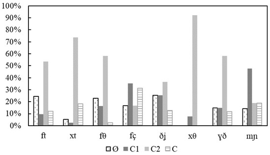 Table 2 shows the number of children in the study per age group (in the four columns on the right) and the children’s two-member cluster productions (in the eight rows, one per cluster). Each of the rows has two separate lines. The top line shows a single number per age group which corresponds to the number of responses per cluster per age group. The bottom line of each row shows two numbers (percentages) per age group; the one on the left corresponds to the percentage of two-member cluster productions, while the one on the right corresponds to the percentage of adult-like cluster productions. Two-member productions include both adult-like productions and any two-member productions in which members are produced either by substituting target cluster members or by any other phonological process. More on this follows in the Section 4 below. Clusters [mɲ] and [mn] were merged into a single category, denoted with [mɲ] in Table 2, because the aggregate data show no differentiation in accuracy or developmental patterns between the two. The number of responses in the youngest age group is limited, less than one-third, in the abstract words targeting the word-initial clusters [fθ], [ðʝ], [xθ], [ɣð], and [mɲ], and this persists for [xθ] at ages [2;6–3;0). This must be considered when comparing the outcomes for each cluster within each age group and across age groups. As a result of a small sample, cluster [ɣð] appears to perform better in the youngest age group compared to even the oldest age group as far as two-member and adult-like productions are concerned, that is, (67%, 67%) versus (52%, 30%). All other clusters perform overall better with increasing age.
