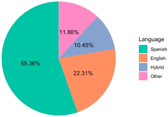 On the other hand, regarding informative languages, Spanish remains the most prevalent linguistic code. However, compared to symbolic languages, its use is much higher, representing 73.87% of the instances. English, on the other hand, is no longer the second most common language, as it was found in only 10.11% of the data. In the advertisements, according to our results, the second most used language was a hybrid of Spanish and English, that is, bilingual ads, which were found in 13.76% of the data, while information in other languages only represented 2.24%—see Chart 2.