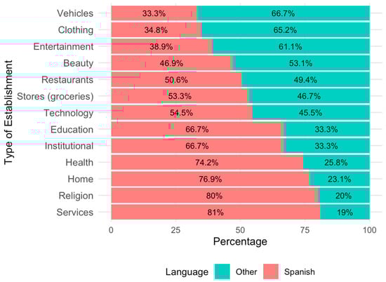 Finally, our second variable to study was the type of establishment. The results of the statistical analysis showed a significant association between this variable and the symbolic language (p < 0.001). In more traditional or formal sectors such as services (80.95% in Spanish), health (74.24% in Spanish), and religion (80% in Spanish), the use of Spanish is predominant. This reflects the social function and the need to maintain closer and more comprehensible communication for the local community, which predominantly speaks Spanish.