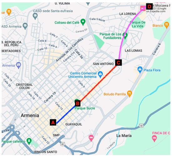 Data collection was conducted in three areas of the city—see Figure 1. Zone 1 (points A and B) encompassed Carrera 14 between Calle 21 and Calle 12; a pedestrian boulevard known as Cielos Abiertos [Open Skies]. This area is recognized for being busy with various food and craft sales points and connects two main parks in the city: Plaza de Bolívar (point A) and Parque Sucre (point B). Zone 2 included Carrera 14 from Calle 12 (point B) to Avenida Las Palmas (point C), where various restaurants, clothing stores, two shopping centers, and two universities are located. Finally, Zone 3 comprises Carrera 14 from Avenida Las Palmas (point C) to Calle 10 Norte (point D). This corridor features a variety of cafés, restaurants, health clinics, important parks for the city, and churches.