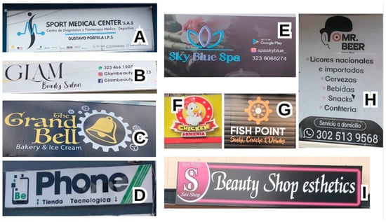 A total of 498 tokens were collected from the LL. After careful review and coding of the data for analysis, the dataset was reduced to 354 tokens, as some signs did not meet the parameters established for this study. Specifically, signs were excluded if they contained only symbolic or informative language, if they were semiotically different but conveyed the same information, or if the same sign was found in multiple locations. Chart 1 presents the distribution of symbolic languages identified in the dataset, meaning the languages used to name stores or establishments. The distribution of symbolic languages in our data shows that Spanish is the predominant language, representing 55.36% of the total instances. English comes in second place with 22.31%. The “Hybrid” and “Other” categories have similar percentages, with 10.45% and 11.86%, respectively. The “Other” category includes languages such as Italian and French, which, while less frequent, were still present in the dataset. Figure 3 presents some examples of English as a symbolic language. Establishments such as “Sport Medical Center”, “Glam Beauty Salon”, “The Grand Bell”, “Phone”, “Sky Blue Spa”, “Chicken Armenia”, “Fish Point”, “Mr. Beer Liquor Store”, and “Beauty Shop Esthetics [sic]” were found.