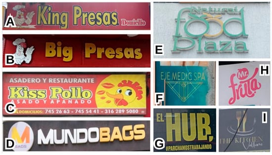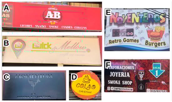 These results indicate a strong predominance of Spanish in the context of informative languages, with a significant presence of bilingual or hybrid ads, where information is presented in a mixture of Spanish and English. In Figure 4, we present examples of stores where English is used to provide information about the products offered, either partially or entirely. Ad A offers, among other items, snacks, smokes, and candies; Ad D offers cafe [sic] and food; and Ad F is presented as a smoke shop. Other ads provide all their information in English, such as sign B, which offers “soufth [sic] ice cream”; sign C, which offers a cocktail bar and food experience; or sign E, which offers retro games and burgers.