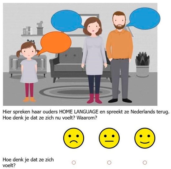Example of the elicitation of Scenario 1.d, “Parent(s) speak(s) home language and child answers in Dutch”. Note: Translation into English: “Here, her parents speak HOME LANGUAGE and she answers in Dutch. How do you think she feels? Why? … How do you think she feels?”.
