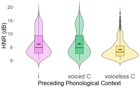 Figure 5 illustrates the voicing rates of final sibilants per preceding phonological context. Sibilants preceded by a high-front vowel [i] (left violin plot) exhibit an average HNR of 6 dB. Sibilants preceded by voiced consonants (middle violin plot) show an average of 6.2 dB. In contrast, sibilants preceded by voiceless consonants (right violin plot) display a lower average HNR of 4 dB.