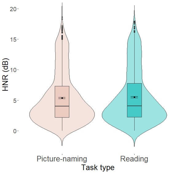 Figure 6 displays the voicing rates of final sibilants by task type. Sibilants produced in the picture-naming task (with no orthographic input) showed an average HNR of 5.4 dB, whereas those produced in the reading task (with orthographic input) averaged 5.5 dB. Statistical analysis confirmed that this difference was not significant (Estimate = 0.13, SE = 0.12,