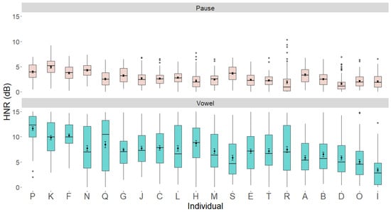 Figure 9 helps illustrate these findings. When the sibilant precedes a pause, HNR values across individuals cluster in a relatively narrow band (approximately 1.6 to 4.9 dB), reflecting the robust stability of the voiceless [s] in BP before a pause. By contrast, when a sibilant is expected to be voiced [z] before a vowel, HNR values span a much wider range (about 3.4 to 11.7 dB). This substantial inter-speaker variability is captured statistically by the large random slope variance mentioned above: some participants produce near-categorical voicing, whereas others barely increase their HNR from the pause baseline, resulting in a rather dynamic pattern of voicing.