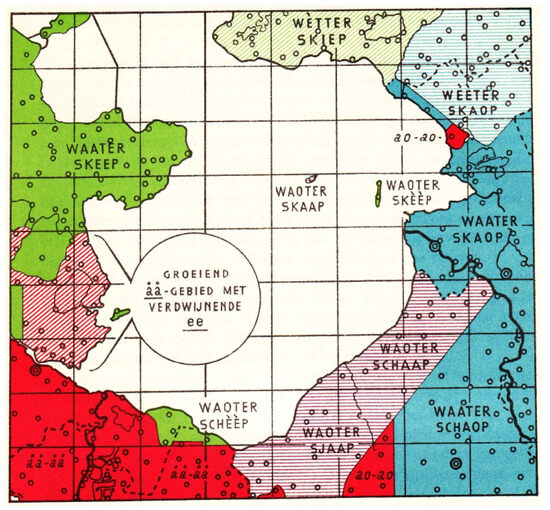 Realisation of the vowels in words for ‘water’ and ‘sheep’. The two vowels involved merged in the red area but are distinct in the green and blue areas. There are separate small spots in the Zuiderzee, all three island spots. The green island in the left part is Marken, the island marked by ‘WAOTER, SKAAP’ is Urk, and the island marked by ‘WAOTER, SKÈÈP’ is Schokland. From Kloeke (1952), originally from Kloeke (1934), obtained using the Meertens Kaartenbank created by Kruijsen and van der Sijs (2016).
