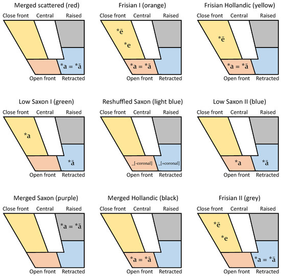 The clusters inferred from the admixture analysis can broadly be categorised into three distinct realisation patterns for the Proto-West Germanic (PWGmc) vowels: (1) a Frisian type, with traces of the Old Frisian *e/*ē; (2) a Saxon type, with distinct vowels for *a and *ā; and (3) a merged type, with a single vowel for *a and *ā.