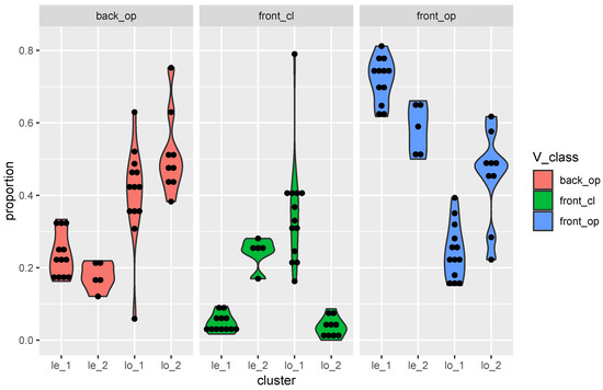 We visualised in Figure 8 the differences between the clusters in violin plots. Clusters 3 (le_1) and 4 (le_2) behaved similarly in terms of having many front–open occurrences, but cluster 3 had the most front–open realisations. Anglo-Frisian brightening (see Note 2) was visible in cluster 2, lo_2, having the consequence that this cluster had more front–open realisations than cluster 1, lo_1. The last two clusters, 1 and 2, had more back realisations. There was one cluster or class shift, the word traag, which shifted from cluster 1 to 3.
